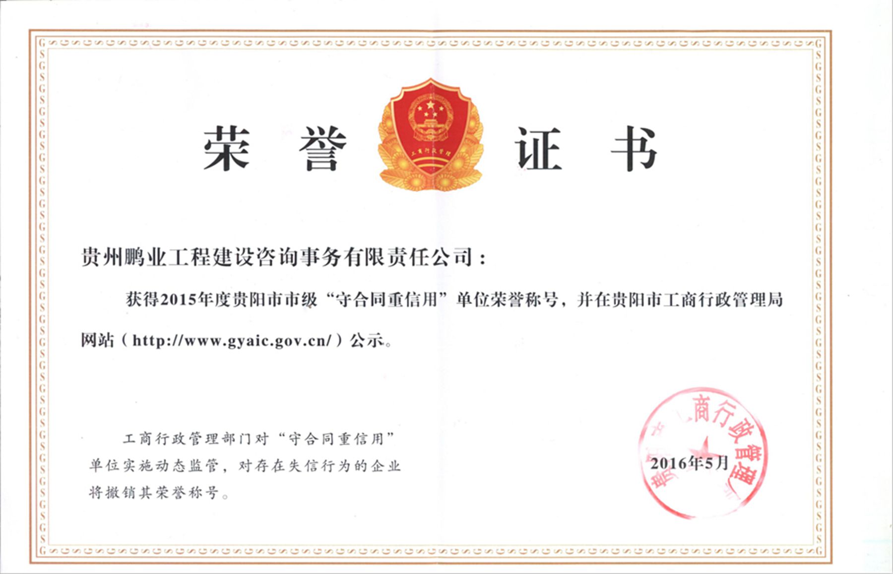 榮獲2015年度貴陽市市級“守合同重信用”榮譽(yù)稱號