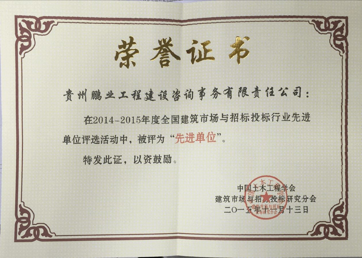 獲得2014-2015年度全國建筑市場與招標(biāo)投標(biāo)行業(yè)先進(jìn)單位稱號